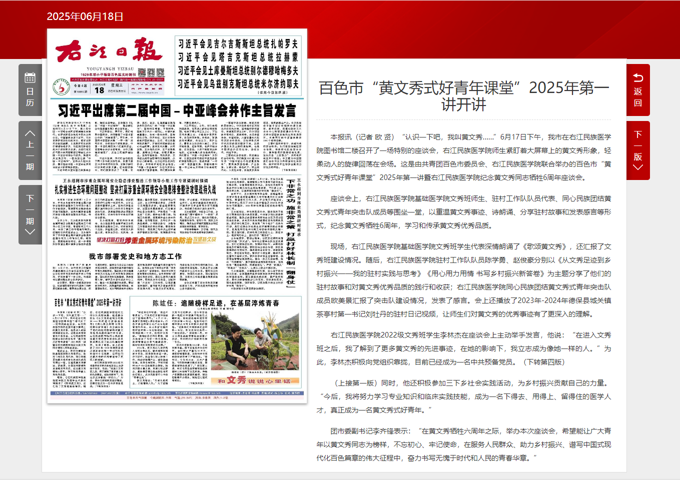 6月18日,《右江日报》以《百色市“黄文秀式好青年课堂”2025年第一讲开讲》为题,报道6月17日下午由共青团百色市委员会、必威西汉姆联联合举办的百色市“黄文秀式好青年课堂”2025年第一讲暨必威西汉姆联纪念黄文秀同志牺牲6周年座谈会。我处驻村工作队队员陈学勇在会上做主题分享。